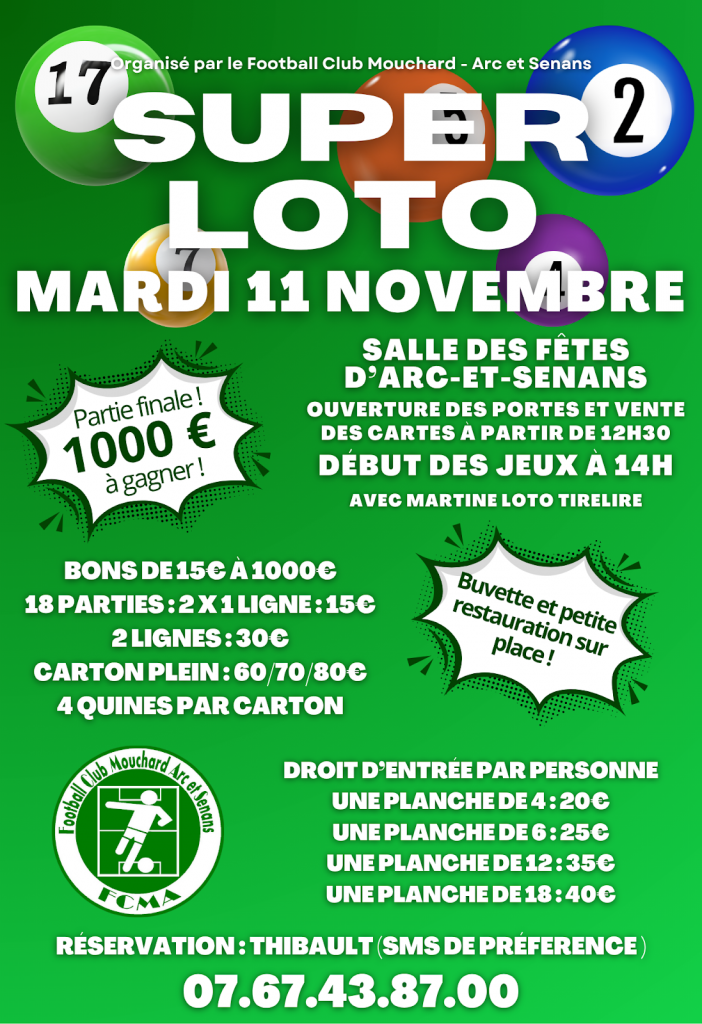 Le loto du club de foot aura lieu le mardi 11 novembre à 14h dans la salle polyvalente d’Arc-et-Senans.